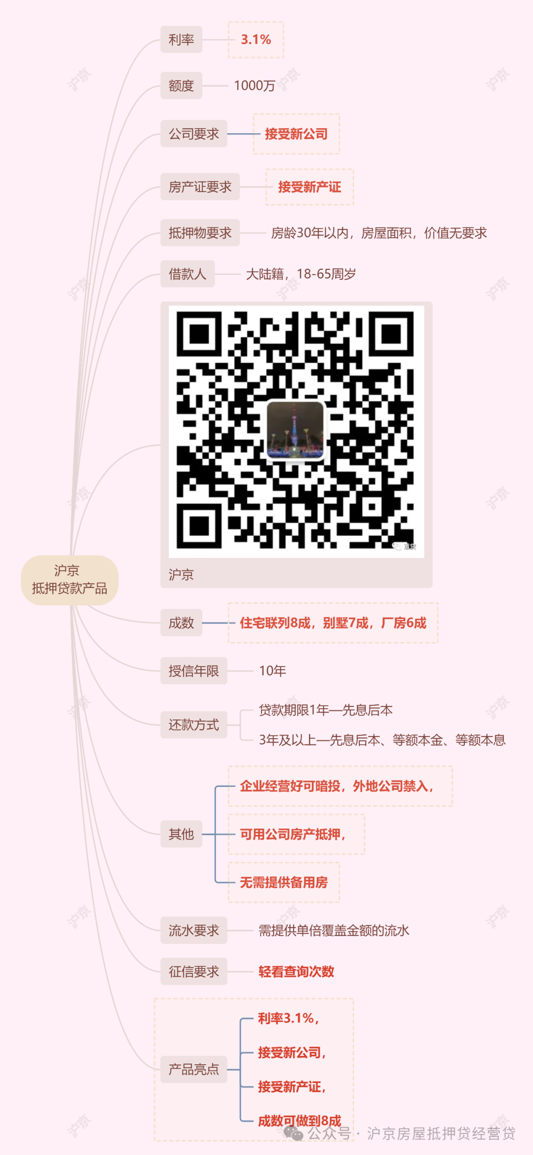 今天沪京为大家介绍的这款抵押贷款产品,利率3.1%,接受新公司,成数可做到8成!!!接下来,沪京将详细介绍这款产品的细则,一起来跟随沪京看看吧!