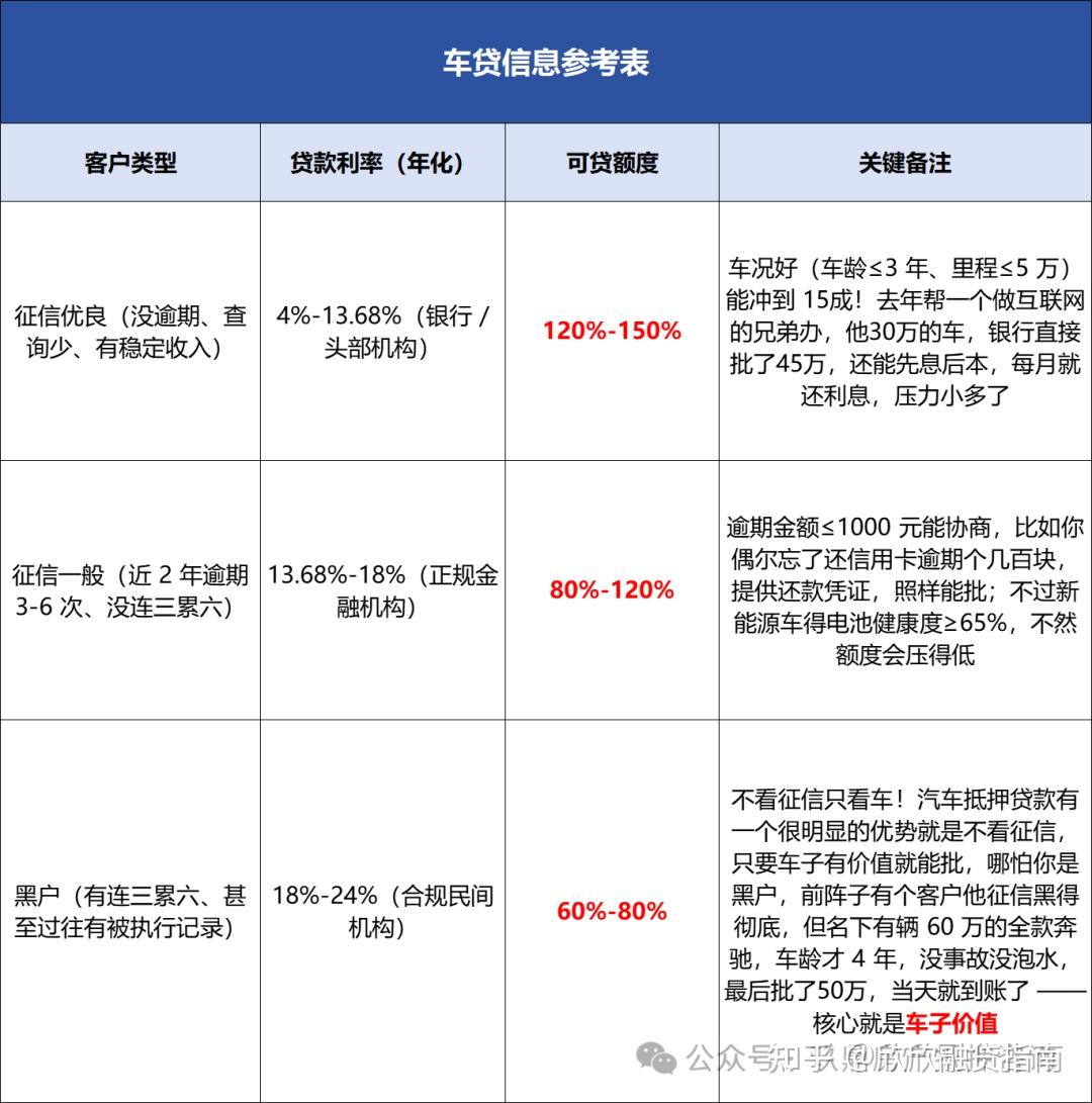 车子是硬通货,你征信好不好,直接决定利息高低;车子值不值钱、车况怎么样,才是额度的硬上限,哪有什么统一标准!直接上干货表格,自己对号入座,一目了然: